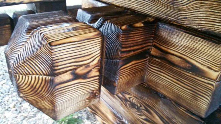 Состаривание дерева обжигом имеет более долгую историю в сравнении с брашированием. Сейчас этот прием используют как дополнительный перед шлифовкой. Древесину обжигают газовой горелкой, паяльной лампой или иным подходящим источником огня. Данный этап технологии необязателен, обработку можно проводить без обжига.