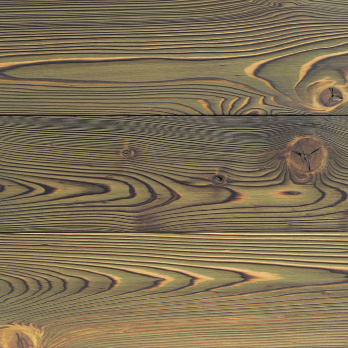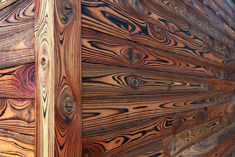 Структура древесины после обжига со шлифовкой видна предельно четко. На фоне мягких слоев в светлых тонах резко выделяются темные контуры с твердой древесиной. Контрастная текстура сразу бросается в глаза, выглядит менее скучно. Обжиг убивает плесень и защищает от насекомых, дерево становится устойчивей к возгоранию, продлевается срок службы материала.