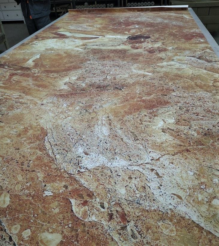 В отличие от натурального камня, который добывается крупными блоками в карьерах, гибкие листы каменного шпона изготавливаются с использованием экстрактов или остатков природного камня.