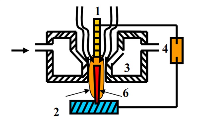В плазмотронах косвенного действия плазменная дуга создается между электродом и соплом, а поток плазмы выдувает плазменную струю.