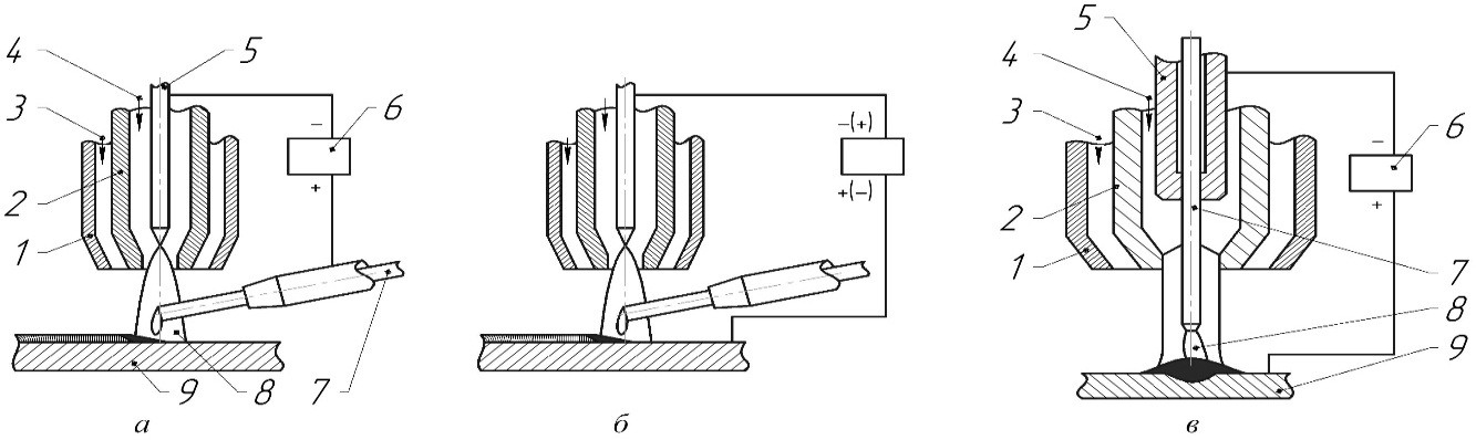 Сварка может проводиться плазменной дугой при сварке прямого действия или плазменной струей при сварке косвенного действия. При прямой сварке плазменная дуга горит между электродом и свариваемым изделием. При косвенной сварке плазменная струя горит между соплом плазмотрона и электродом.