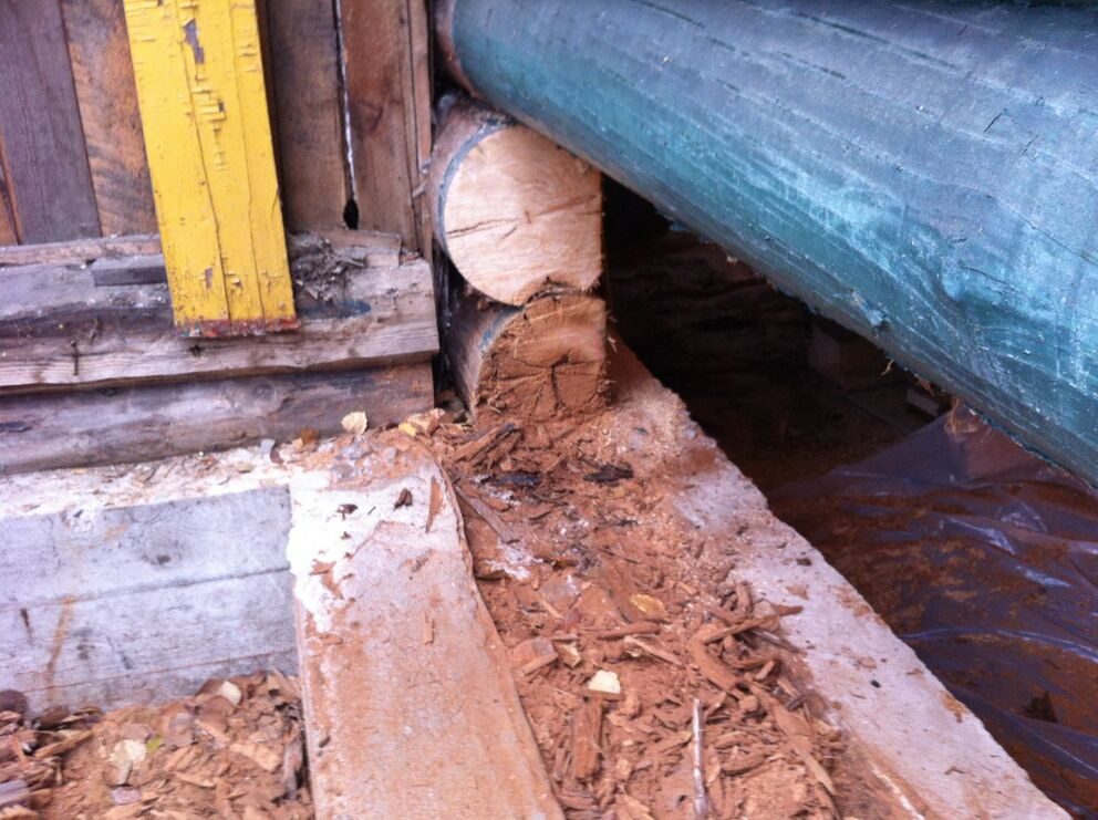 Осмотр потребуется не только снаружи, но и изнутри. Чтобы произвести осмотр изнутри, разберем в помещении пол, и откроем доступ к венцам сруба. Осмотр произведем простукиванием молотком бревен, может быть, что с виду здоровая древесина окажется трухой. Бревно поддаться поражению по всей длине не может, поэтому необходимо определиться с наиболее прочными участками, чтобы под них установить временные опоры, клинья либо домкраты. Под домкраты нужно подготовить места – это обычно верхняя сторона бревна и сердцевина, очистить участок от слоя истлевшей древесины.
