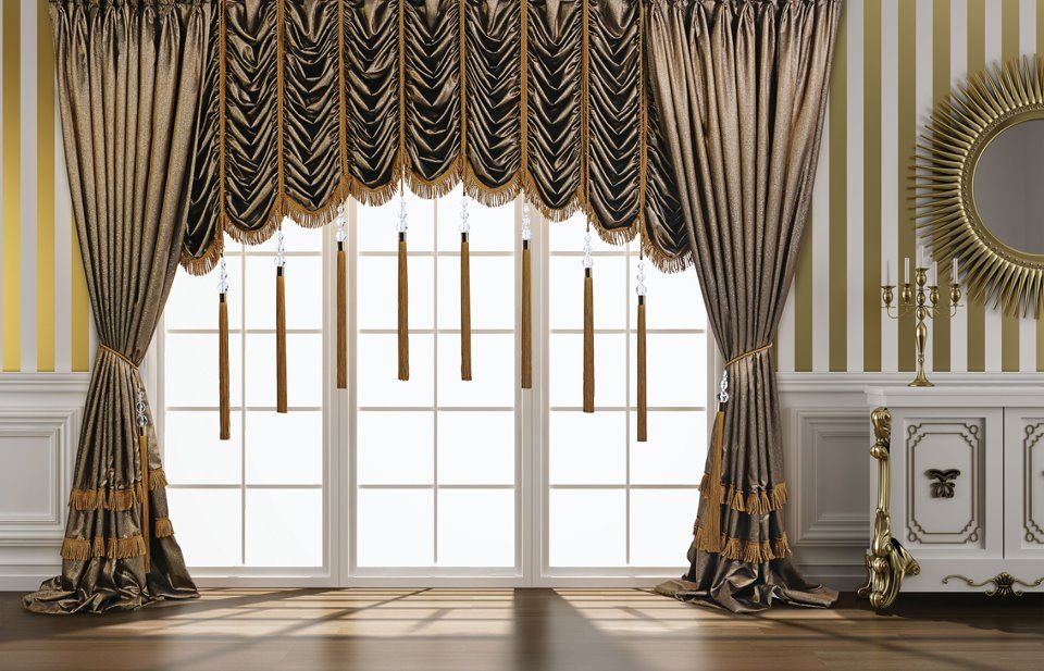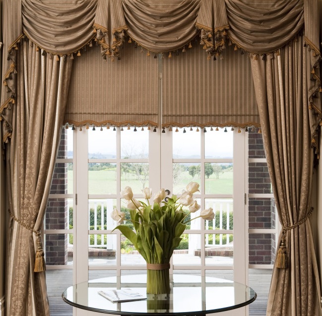 Высокий дизайн. Превосходно оформленные ламбрекены, показанные здесь, лежат прямо над традиционными драпировками, добавляя современный стиль поверх традиционного дизайна, создавая потрясающий вид.