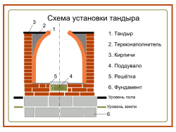 Схема установки тандыра.Собственно тандыр представляет собой керамическую полусферу объёмом от 0,25 до 1 куб. м. с круглым проёмом в стенке или верхе (диаметром ок. от 0,5 и до 0,7 м.). Ставится традиционно во дворе на глиняную платформу горлом вверх (осью вертикально) или осью горизонтально (горло при этом смотрит на горизонт). Вертикальные обычно используются для выпечки самсы, хлеба и даже шашлыка, а горизонтальные только для выпечки хлеба тандыр-нан. Стенки снаружи обкладываются кирпичом из сырой глины. Это делается для повышения теплоёмкости печи. При использовании тандыр жарко натапливается углем, дровами или хворостом[1]. Закладка дров, выемка золы и сажание хлеба в тандыр производится через одно и то же отверстие. После того как тандыр достаточно прогреется внутренние стенки тандыра быстро протираются от налёта гари. После этого их спрыскивают водой и затем прилепляют предназначенные к выпеканию изделия. Они доходят до готовности за счёт жара накопленного в толстых стенках тандыра. После этого, обычно при помощи специального ковша и крюка с длинными рукоятками, изделия вынимаются из тандыра. В Армении тандыр традиционно размещается ниже уровня пола внутри дома.