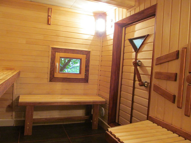 Наиболее спорным вопросом является установка окна в помещении парилки. Во-первых, даже небольшое по размерам стекло в 5-7 раз увеличивает потери тепла. Во-вторых, температура воздуха в парилке настолько высока, что это приводит к появлению трещин в стекле. Кроме того, постоянные температурные колебания могут привести к появлению щелей и деформации рамы. В таких условиях рамы из ПВХ непригодны для парилки, поэтому единственным вариантом будет использовать раму окна бани из липы или ольхи. При всех недостатках оконный проем в парилке даже небольших размеров позволяет быстро и эффективно проветрить помещение в случае его задымления или образования большого количества угарного газа.