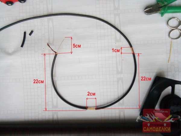 Следующим делом берем линейку и отмеряем полученный при делении результат, не забивая оставить 2 сантиметра в основании. То есть, если автору необходим кабель длиной 14 сантиметров, он мерит 2+14 см.