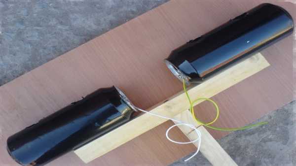 Двухбаночная антенна для телевизораСоздать простую баночную антенну можно просто припаяв две банки к кабелю. Эта комнатная антенна для телевизора своими руками подходит для просмотра каналов на небольшой-средней удаленности от передатчиков. Согласовывать в этой схеме ничего не нужно, особенно если длина кабеля менее 2 метров.