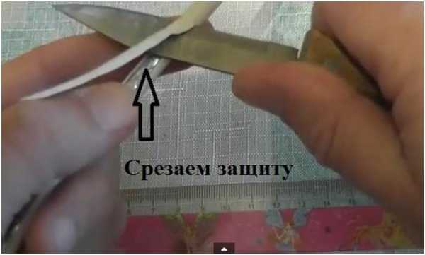 Дальше от метки отступаем необходимое нам количество сантиметров. Откусываем лишнюю часть кабеля. На метке делаем надрез и счищаем защиту кабеля.
