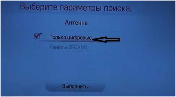 Потом переходим в пункт меню «Автопоиск». В следующем окне выбираем пункт «Антенна», затем в параметрах поиска галочку оставляем в пункте «Только цифровые каналы». Нажимаем «Выполнить».