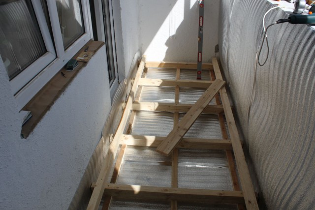 Укладка теплоизоляции целесообразна в случае, если лоджия застеклена. Самые распространенные теплоизоляционные материалы – пенофол и пеноплекс (подробнее в статье «утепление балкона пеноплексом«). Можно использовать и минвату, но ее придется сверху закрывать пленкой и обшивать оргалитом. Только в этом случае по комнате не будут летать мелкие частицы минеральной ваты, раздражающие легкие.