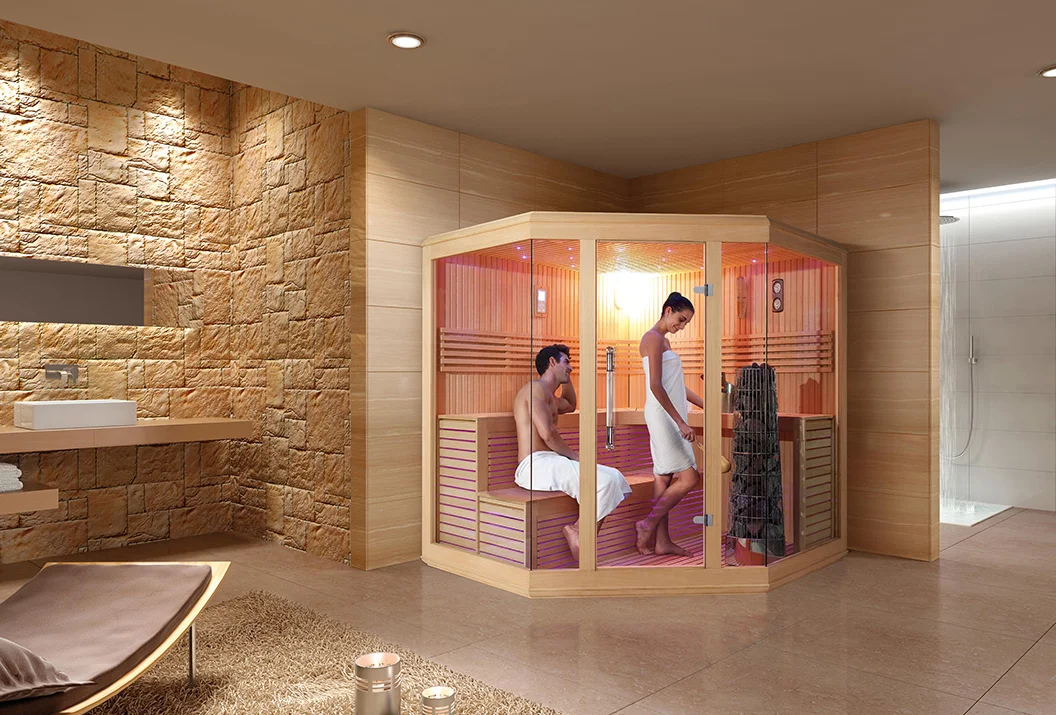 - Финская или сухая сауна, где воздух прогревается до 90-110 оС, а его влажность находится на уровне около 10%, в то время как в обычной комнате показатель влажности находится на уровне 50-60%. Благодаря высокой температуре и сухому воздуху в финской бане, человек интенсивно потеет, избавляясь от лишней влаги и токсинов.
