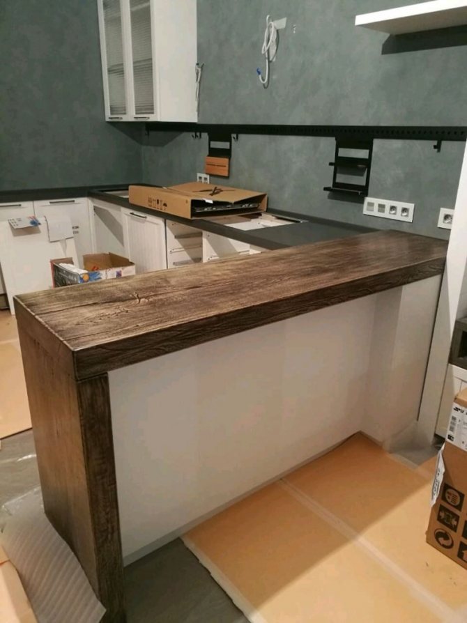 Важно! Для гармоничного сочетания кухни и барного стола он должен быть выдержан в одной цветовой гамме и сделан из того же материала, что и другие поверхности на кухне.