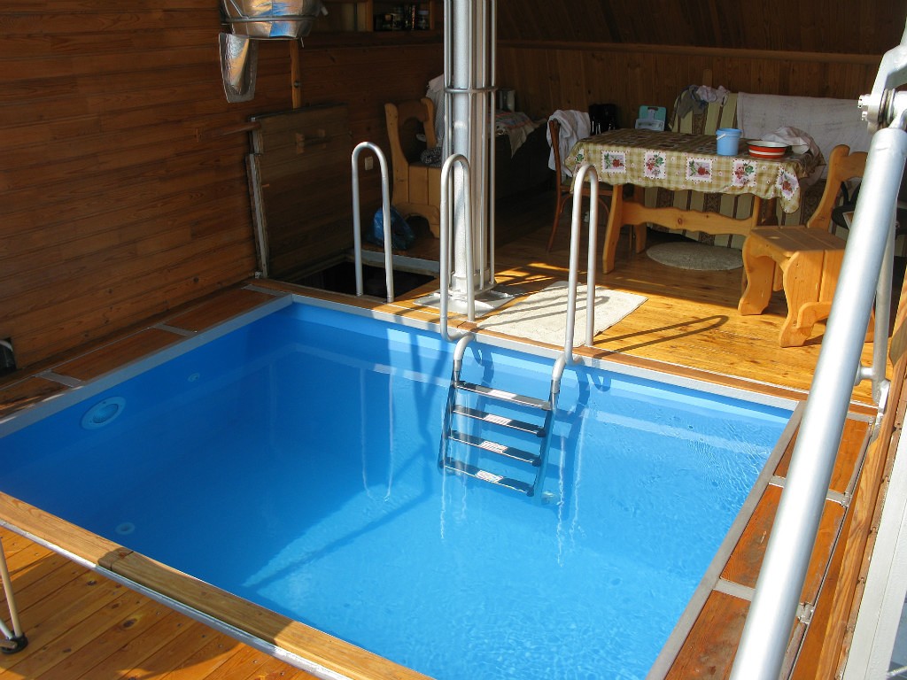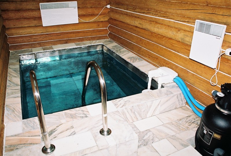 Кроме того, существуют сборные искусственные водоёмы из пластика. Они выпускаются и поставляются вместе со всем нужным для работы оборудованием. Их можно вполне разместить в помещении бани или специально построенной для этого комнате.