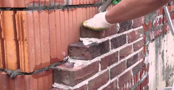 Облицовку лучше начинать с угла, высотой 5-6 рядов, и уже по ним равнять остальные кирпичи. Во время кладки нужно сразу удалять выступивший раствор с поверхности.