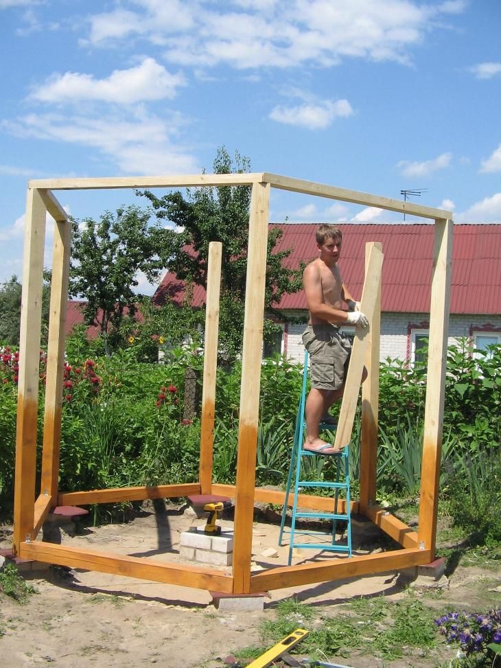 Фото: деревянная беседка – каркас из доски, крыша из ДВП
