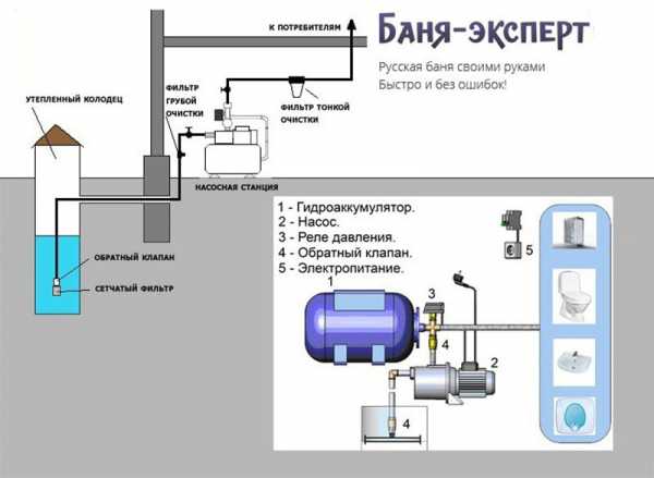 Утепление насосаНа этом этапе можно производить пуско-наладочные работы – включить насос и проконтролировать подачу воды, а также визуально определить отсутствие протечек на трассе. Перед первым включением в него необходимо залить воду, чтобы она полностью заполнила все трубы и выдавила из них воздух – с завоздушенными трубами насос не захватит воду из колодца. Также следует открыть вентиль гидроаккумулятора, чтобы вода и воздух ушли без давления. Этот прием позволит запустить насос без повышенной нагрузки и выдавить весь воздух из водопровода. Схема разводки труб по бане и/или дому представлена ниже:
