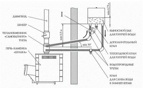 Схема подачи жидкостиЕсли баня находится вблизи к дому, можно рассмотреть вариант подвода горячей воды от котла с жилища. Труба должна быть надежно утеплена, чтобы жидкость не успела замерзнуть. Но в основном, водоснабжение делается отдельным от дома. Для этого устанавливается печь. Существует множество разновидностей печей, но чаще при банях используют дровяные, так как они наиболее продуктивны в этом месте.