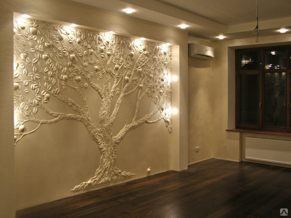 Трафареты представляют собой листы из плотных материалов для создания объемного рисунка. Крепятся к стене, отверстия заполняются шпатлевкой, после чего над поверхностью получается еще один выпуклый слой. Популярными считают орнаменты кирпичной кладки, геометрических фигур, а также различные растительные узоры, из которых создаются целые панно.