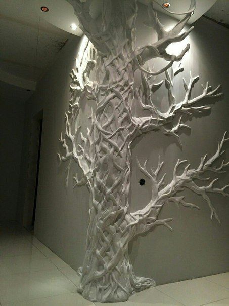 Но, для реализации этого способа потребуются определенные навыки работы с таким материалом. Достаточно часто объемное дерево, вылепленное из гипса, оставляют не колорированным, что придает интерьеру изысканность и стиля. Иногда в этой технике используются специальные составы на основе полимеров, которые разводятся до пастообразного состояния и образованной пеной при помощи шаблонов наносится барельеф.