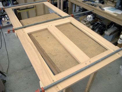 - Фиксируем щит при помощи струбцин либо упорами с применением клиньев. Повторно обрабатываем полотно, после чего шлифуем.
