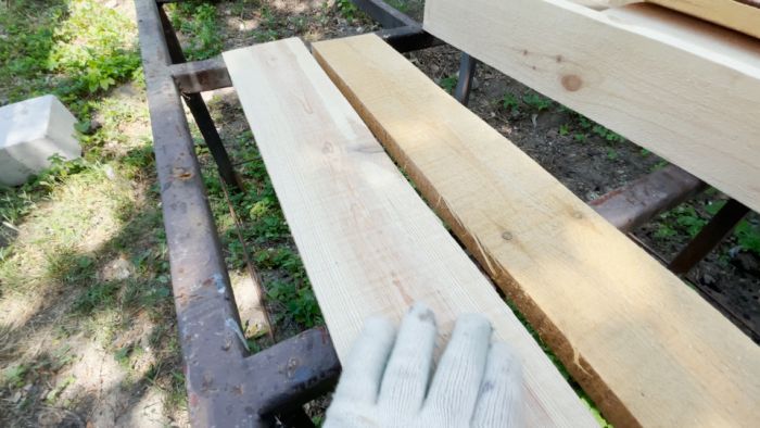 - Доски нарезаем нужной длины с некоторым запасом. Для определения их количества достаточно разделить общую ширину полотна на ширину имеющихся досок.