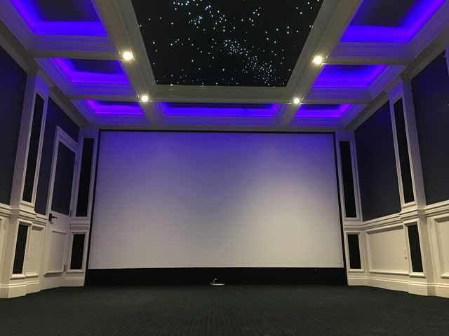 После того, как краска высохнет, вы можете приступить к настройке динамиков, экрана и проектора. Для среднего домашнего кинотеатра лучший размер экрана составляет от 110 до 120 дюймов. Вы также можете обрамить экран панелями авансцены, чтобы скрыть центральный, левый и правый динамики. Остальные динамики можно скрыть за акустическими художественными панелями.