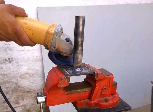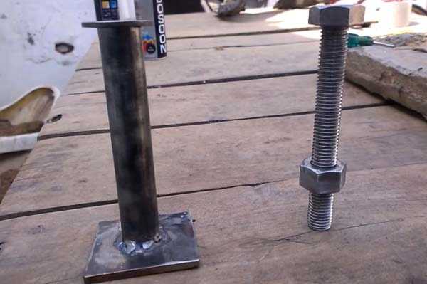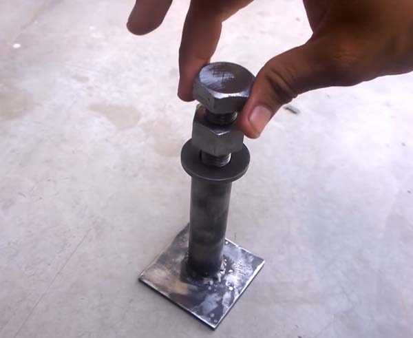 Первым делом отрезаем стальную трубку подходящего диаметра длиной примерно 20–25 см. Затем привариваем ее к квадратной пластине (основание винтового домкрата). Зачищаем поверхность шлифовальным диском. Для второй части конструкции потребуется длинный болт с гайкой и шайба.