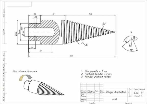 Чертежи этого инструмента достаточно просты и их можно найти во всемирной сети, допустим . По ним можно понять, что создать такое оборудование своими руками не так сложно. Особенно относительно других технических инструментов современности. Тем более что «аппаратура», требующаяся для сотворения колуна не столь редка, да и в целом сама схема его проста.