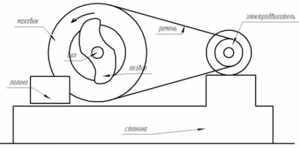 Одна из самых простых и надёжных конструкций. Для постройки такого дровокола необходима прочная станина, сваренная из металлопрофиля, электродвигатель мощностью 2-2,5 кВт и понижающая клиноременная пара.