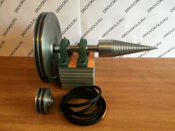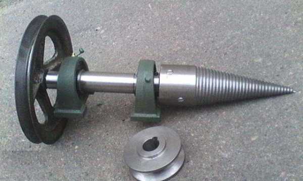 Ну что ж, конус вам необходимо устанавливать на вал электродвигателя дровокола, количество оборотов у которого не должно превышать пятьсот. Мощность вашего электродвигателя должна составлять при этом около трёх, быть может, пяти кВт. В другом подходящем вполне вам (если у вас нет проблем с доставанием материалов, а они, быть может, есть ) варианте устройство составляется из простых двухручейных шкивов. Они должны быть разного диаметра плюс должны присутствовать приводные ремни. В этом случае на вал с дровокольным винтом вам необходимо будет установить некий большой шкив, а, соответственно, на вал с двигателем — малый .