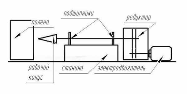- Винтовой (конусный). Устройство представляет собой прочную станину, на которой установлен вал. На валу плотно посажен конусный винт, который редко можно встретить в продаже, но выточить на токарном станке — запросто. Его чертежи представлены на страничке. Принцип его действия прост — бревно устанавливается на станину, после чего винт вкручивается в него, и за счёт конуса раскалывает на две части.