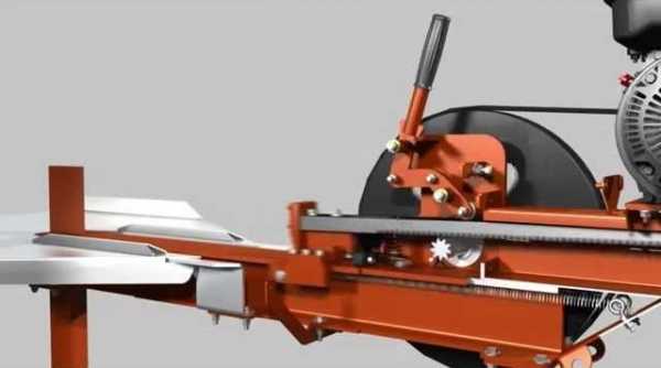 Данную конструкцию можно видоизменить, заменив сложную гидравлическую систему механической. Для этого потребуется реечная передача, как показано на фото выше. При вращение зубчатого колеса происходит перемещение зубчатой рейки. То есть, вращательное движение превращается в поступательное. Колесо сажается на вал редуктора, рейка закрепляется к штоку давящего устройства. Редуктор соединяется с двигателем. Такой дровокол механический проще в работе и обслуживании. Плюс, проще в сборке, да и сложных узлов в нем нет.