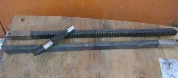 Самодельный реечный дровокол сделать своими руками несложно. Основным механизмом является пара «шестерня-рейка» (фото ниже), которая приводит в движение толкач, упирающий бревно в нож, тем самым раскалывая его пополам. Все комплектующие крепятся на мощную металлическую раму. При помощи этой машины можно колоть бревно любого диаметра. На схеме показана эта машина в сборе: