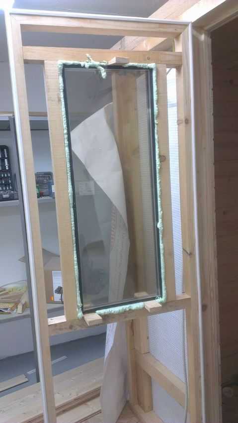 Это дверь не просто в парилку, это деревянная дверь со стеклом, ведущая в настоящую сауну! При этом создаётся она очень просто. Из нескольких брусков создаётся рама для дверного полотна, а внутри этой рамы создаётся рама поменьше для окна. Затем во внутреннюю оконную раму устанавливается стекло и фиксируется при помощи монтажной пены.
