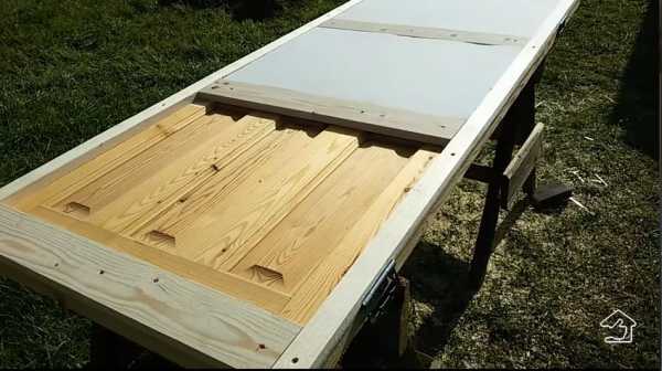 Для начала на задней стороне дверного полотна он создал раму из брусочков толщиной 2 сантиметра, как и листы пенопласта, которые были прикручены к дверному полотну с помощью шурупов, затем эта рама была разделена на три «окошка» с помощью двух коротких поперечных брусков – перемычек. В эти «окошки» вставляется пенопласт, который можно зафиксировать при помощи монтажной пены. Поверх этой конструкции накладывается дощатое покрытие.