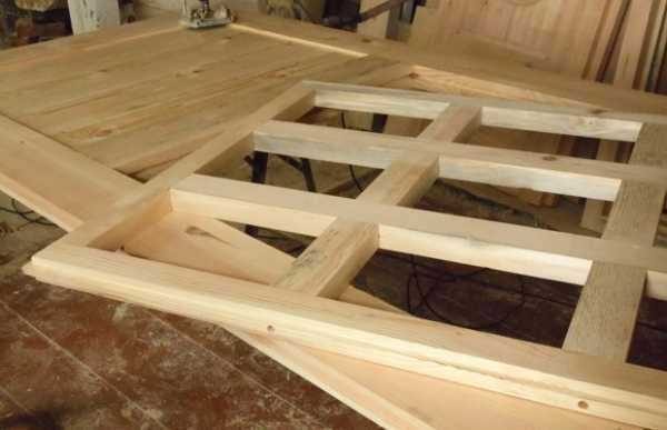 - на первом этапе изготавливается полотно. Для этой цели шпунтованный материал обрезается до нужной длины, с одной доски срезается шип, и поверхность материала нужно профуговать и добиться идеальной гладкости. Далее необходимо собрать полотно в черновую конструкцию: это осуществляется путем плотного соединения досок между собой. Собранное полотно равняется и обрезается по заранее определенным размерам. Выполняется чистовая сборка, при которой доски промазываются клеевым составом и плотно забиваются в пазы киянкой. Готовому полотну нужно дать время на просушку – примерно 2-3 дня;