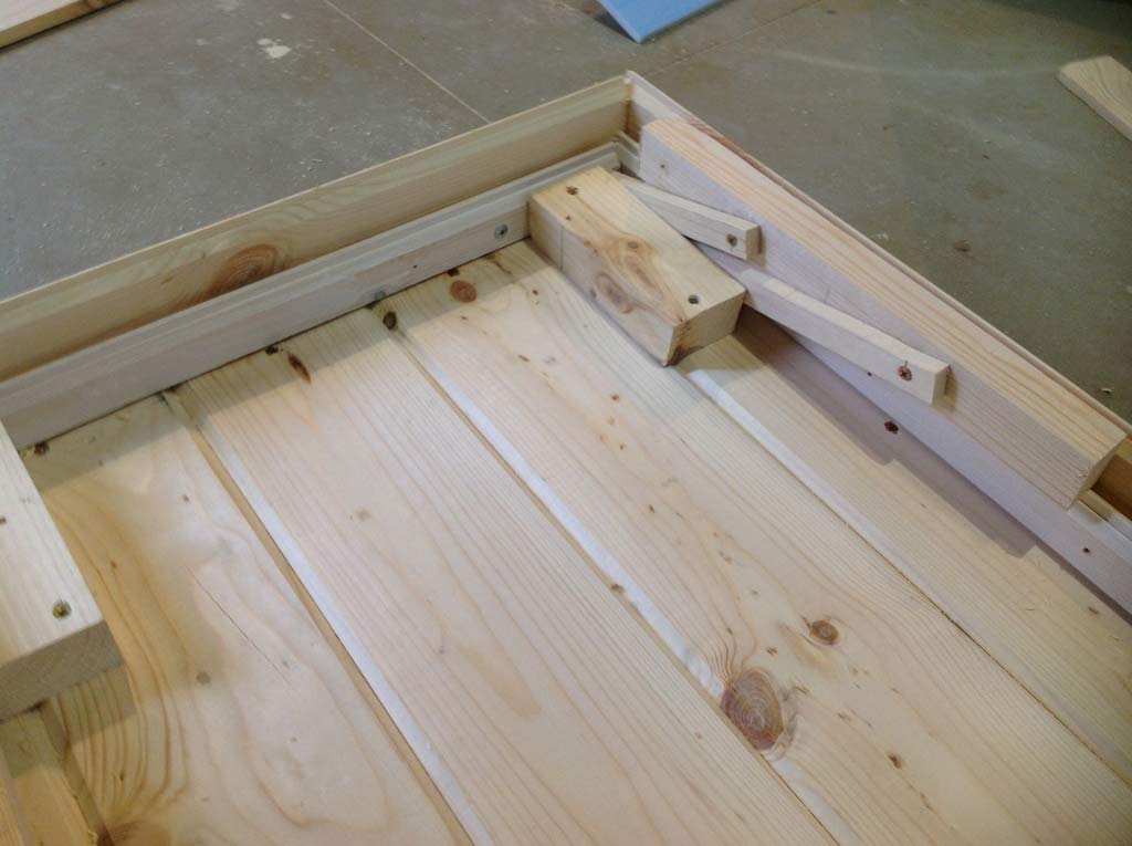 Перед креплением каркаса на днище устанавливаются две доски, именно на них укладывается люк. Далее на них укладывается конструкция и выравнивается клиньями. Для контроля ровности угловых конструкций используйте уровень.