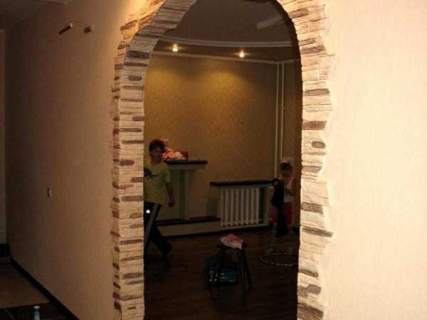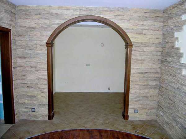 - Искусственный камень, несмотря на свою дороговизну, остается одним из самых популярных вариантов оформления бездверного межкомнатного прохода. Технология изготовления таких материалов предполагает возможность получения абсолютно любого цвета. Декоративным камнем украшают периметр арки, однако возможен вариант облицовки большой части стены вокруг входного элемента.