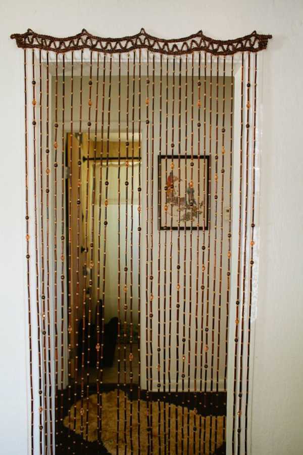 Поклонникам восточной культуры можно подумать о бамбуковых шторах. Они изготавливаются из дерева. Встречаются разнообразные варианты, сочетающие палочки и бусинки. При этом такой вариант не станет скоплением были и будет свободно пропускать воздух между комнатами.