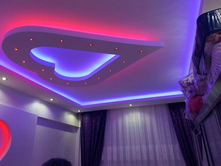 Это могут быть треугольники произвольной формы и размеров, уложенные на потолке в относительно хаотичном беспорядочном порядке. С помощью подобранной фиолетово- розовой расцветки и дополнительного подсвечивания создаётся впечатление осколков льдин на поверхности водоема.