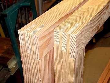- Стягивающая рамка изготавливается из обвязных брусков, которые должны быть толще, чем филенки на 5 мм. Бруски отфуговывают и отшлифовывают, а затем соединяют при помощи шипов с проушинами.