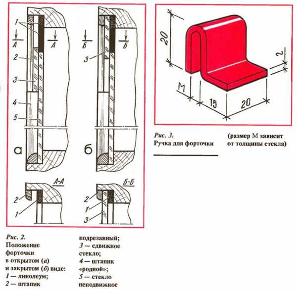 увеличить Да, совсем забыл! При установке стекла от длинных («вертикальных») штапиков, прижимающих боковые края стекла, отрезаем сверху куски длиной 55 см и стекло укрепляем этими укороченными штапиками, не забыв установить и «родной» короткий штапик по нижнему краю стекла. Таким образом, получилось, что теперь боковые штапики по высоте не перекрывают обрезанное стекло (см. рис. 1, б). Теперь из оконного стекла такой же толщины, что и стекла в раме, вырезаем два прямоугольника, длина которых составляет 30 см, а ширина — на 1...2 мм уже проема под стекло в створке окна. Боковые кромки и углы вырезанных прямоугольников заоваливаем наждачной бумагой, бруском или мелким напильником.В створках на сторонах выборок (четвертей) для стекол, но не занятых стеклом, укрепляем полоски из пластика (рис. 1, в), по которым будут скользить при перемещении сдвижные стекла, то есть наши прямоугольники. Лучший материал для таких полосок — тонкий безосновный линолеум, толщина которого должна соответствовать толщине стекла. Понятно, что ширина полосок соответствует размерам выборки под стекло в оконной раме и нежелательно, чтобы край полоски выступал в проем створки. Кстати, полоски из пластика не только служат «подстилкой» для сдвижных стекол, но и играют роль своеобразных прижимов, удерживая стекла от самопроизвольного сползания вниз. Итак, мы вставили в рамы обрезанные стекла, укрепили их с трех сторон штапиками (причем боковые штапики предварительно укоротили на 55 см), вырезали стекла для форточек и укрепили в свободных от стекол выборках полоски линолеума. Теперь возьмемся за оставшиеся штапики (отрезки боковых и верхний), которые придется сделать тоньше на толщину стекла. Проще всего это сделать рубанком, но можно стамеской или ножом. Далее прямоугольные сдвижные стекла устанавливают на свои места в оконные переплеты, при этом во внутреннюю створку сдвижное стекло укладывают изнутри, а в наружную — снаружи. Вставленные стекла проверяют на легкость перемещения вверх-вниз (при скольжении по полоскам из линолеума и нижнему стеклу они не должны заклинивать и утыкаться углами в переплет).Удостоверившись, что все в порядке, крепим на свое место обрезанные штапики. Последние к стеклу прижимают так, чтобы они позволяли сдвижному стеклу перемещаться при небольшом усилии (рис. 2). В верхней части сдвижных стекол устанавливают ручки (рис. 3). Крепят ручку на стекло-форточку следующим образом. В щель, образовавшуюся в ручке при ее изгибе из металлической полоски, подкладывают тонкую резинку и с усилием надвигают ручку на верхний край стекла. Размер «М» щели зависит как от толщины стекла, так и от толщины используемой резины, но резину выбирают не толще 1 мм. Соответственно под ручку в верхнем штапике и в верхнем бруске створки делают выборку, что позволяет полностью поднять сдвижные стекла вверх. Повторяем, требуется, чтобы сдвижные стекла перемещались от нижнего («открыто») до верхнего («закрыто») положения с небольшим усилием. В верхнем крайнем положении край сдвижного стекла должен заходить под верхний штапик, надежно изолируя тем самым внутреннее помещение от внешней среды. Описанная конструкция форточки позволяет регулировать не только расход воздуха, но и направление его потока, что осуществляется установкой верхних срезов наружного и внутреннего 