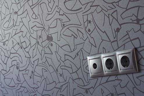 Тема граффити в нашем интерьере поддержана рисунком обоев на противоположной стене.