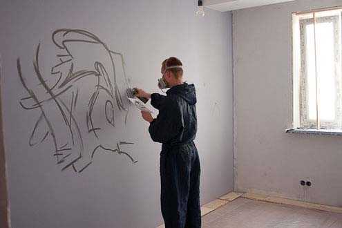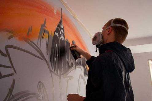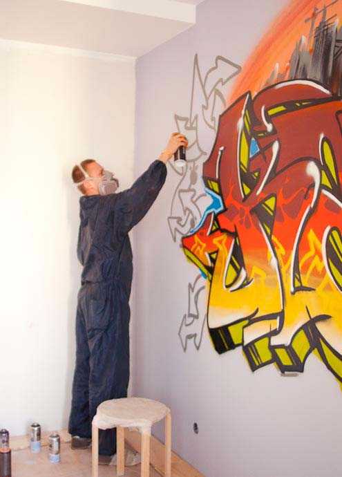 До нанесения нашей росписи стены должны быть соответствующим образом подготовлены. Лучше всего их выровнять и покрыть акриловой краской. Впрочем, аэрозольные краски прекрасно держатся на самых разных поверхностях, а, например, фактура необработанного кирпича или обои с текстурой могут привнести желаемый декоративный эффект. Все зависит от задумки дизайнера. Какой бы не была выбранная поверхность, ее нужно очистить от пыли и загрунтовать.