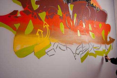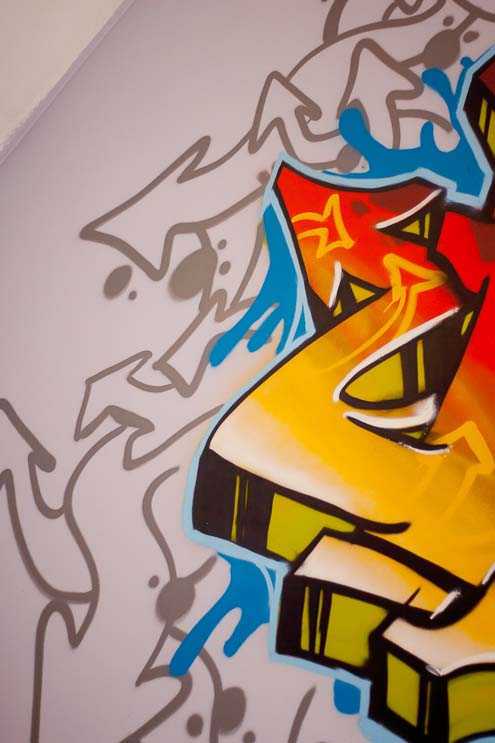 Наиболее популярен в интерьере так называемый «дикий стиль» (wildstyle) – сложное, «дикое» переплетение элементов. Основой часто выступает надпись, стилизованная многоуровневым переплетением элементов, вытягиванием и заострением углов и т.п. Такой стиль пользуется наибольшей популярностью у профессиональных райтеров – художников граффитистов ( от английского write – писать), Поэтому первое, с чего начинается графити – красивый эскиз.