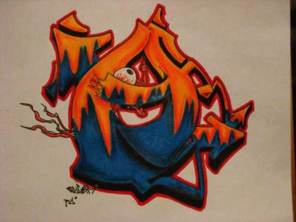 Когда эскиз граффити «в карандаше» готов, наступает очередь фломастеров и карандашей. Все контуры обводятся, изображение раскрашивается.
