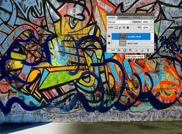 Нажмите на иконку Добавить слой маску (Add layer mask) в нижней части панели Слои (Layers), чтобы добавить маску слоя к слою с изображением граффити. Установите Цвет переднего плана на #000000 и выберите Гранжевую кисть (Grunge Brush), прокрасьте на маске слоя, чтобы скрыть некоторые эффекты граффити в районе лица парня.