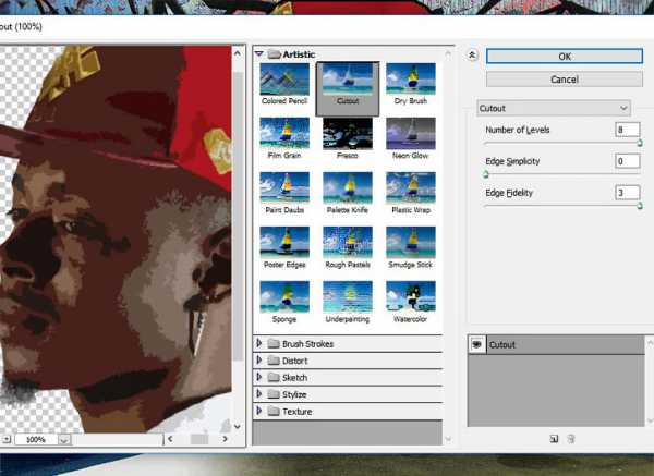 Применим к этому слою Фильтр: Переходим во вкладку Фильтр (Filter) - Имитация (Artistic) - Аппликация (Cutout) и выберите Количество уровней (Number of Levels) 8, Простота краев (Edge Simplicity) 0 и Четкость краев (Edge Fidelity) 3.