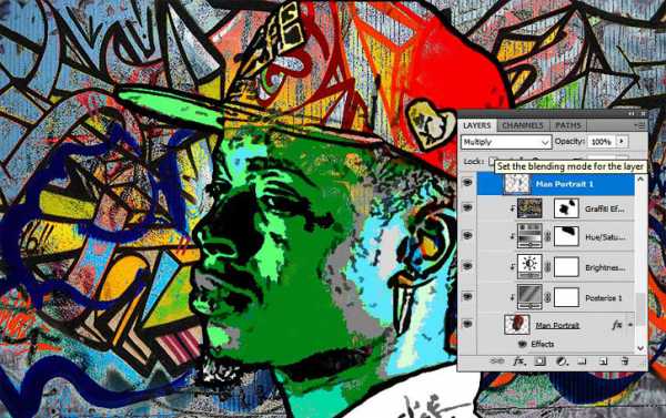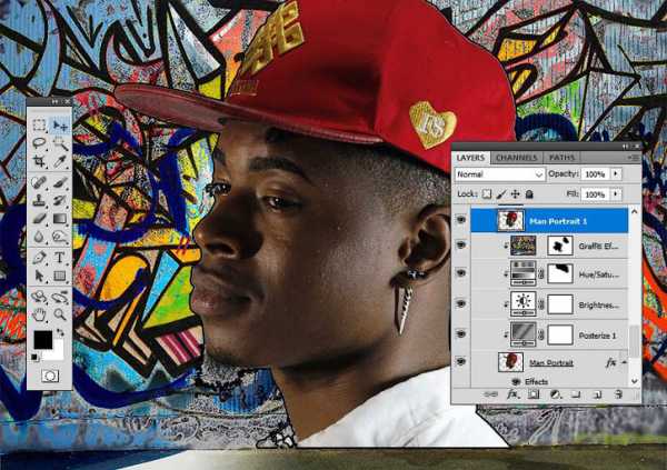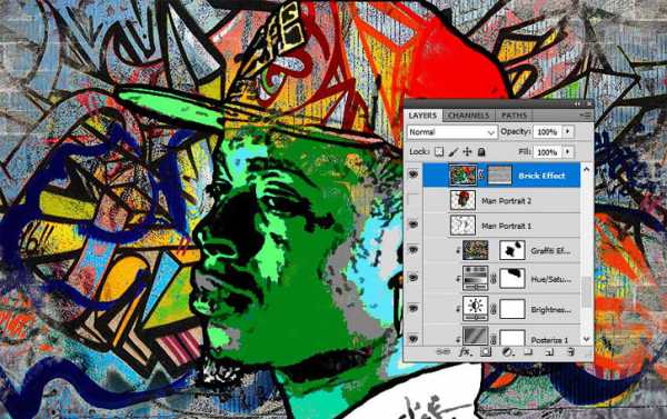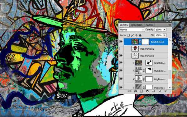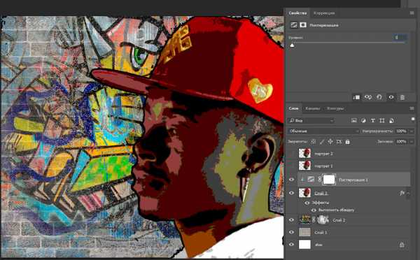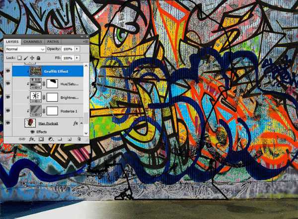 Скопируйте слой с текстурой граффити, поместите его над корректирующими слоями, кликните левой кнопкой мышки между этим слоем и нижележащим, с зажатой клавишей ALT. Теперь и этот слой будет использован в качестве обтравочной маски к слою с портретом.