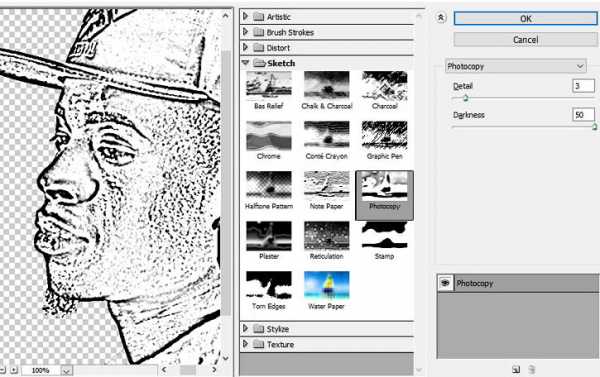 Переходим во вкладку Фильтр (Filter) - Эскиз (Sketch) – Ксерокопия (Photocopy) и выбираем Детализация (Detail) 3, Затененность (Darkness) до 50.